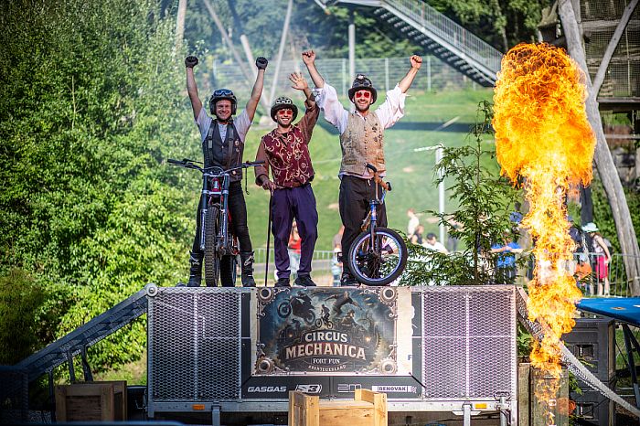 Zažil jsem další léto plné exhibic v německém Fort Fun Abenteuerland – tentokrát už podruhé a znovu ve spolupráci s italským týmem Folco. Původní vlaková westernová show se ale změnila na novou akční steampunkovou Circus Mechanica přímo uprostřed parku, aby ji mohlo vidět víc lidí. Na place jsme strávili 51 dní v kuse a jeli až tři vystoupení denně. Bylo to náročné, ale stálo to za to.
